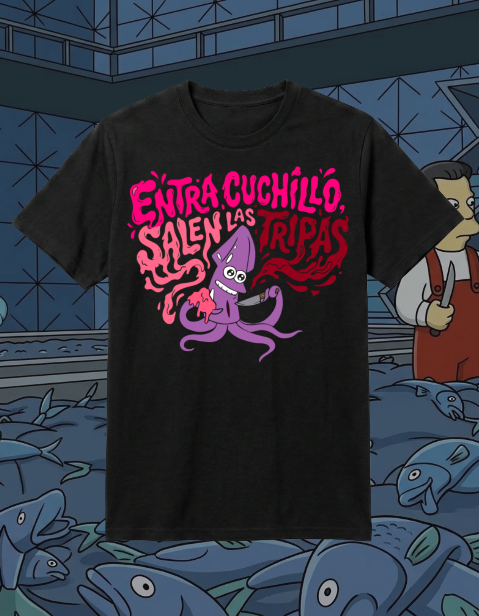 Inspirada en el viaje de los Simpson a Japón, esta polera captura el mantra de Homero mientras intentaba (fallidamente) dominar el arte de destripar pescado. Un diseño vibrante, con un toque “kawaii-gore” que solo los verdaderos conocedores de la Temporada 10 sabrán apreciar.